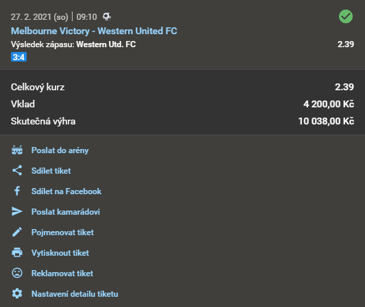 RANNÍ NAPROSTO EXKLUZIVNÍ MEGA "TUTOVKA"! = DLE NAŠEHO NÁZORU ABSOLUTNÍ POVINNOST VSADIT! = EXTRÉMNĚ DOPORUČUJEME! => DŮVĚRA 98.5%! 2.39 27. 2. 2021 09:10 Melbourne Victory - Western United FC TIP: 2 Zobrazit OK Zobrazit + 2 390 Kč
