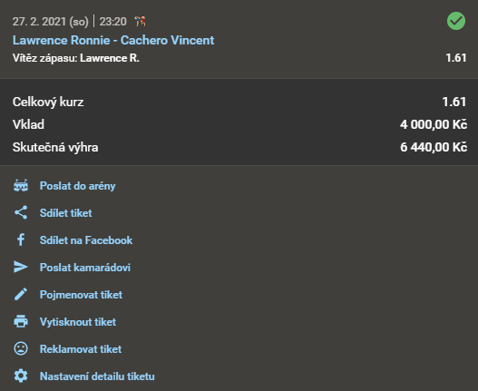 POZDNÍ VEČERNÍ MMA TIP S VYSOKOU DŮVĚROU 98.2% ZA VELICE FÉROVOU CENU! = DOPORUČUJEME! 1.71 27. 2. 2021 23:20 Lawrence Ronnie - Cachero Vincent TIP: 1 Zobrazit OK Zobrazit + 1 710 Kč