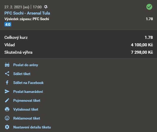 ABSOLUTNÍ POVINNOST VSADIT! = DLE NAŠEHO NÁZORU NAPROSTÁ MEGA TUTOVKA! = EXTRÉMNĚ DOPORUČUJEME! = 98.6% DŮVĚRA! 1.78 27. 2. 2021 17:00 PFC Sochi - Arsenal Tula TIP: 1 Zobrazit OK Zobrazit + 1 780 Kč