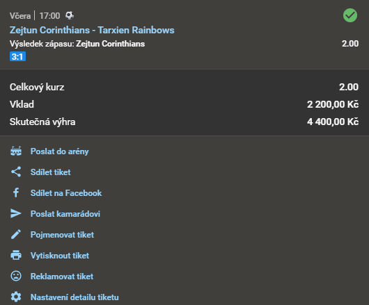 Název doporučeného tipu Kurz Datum a čas Náš tip Analýza Výsledek Fotografie tiketu Při sázce